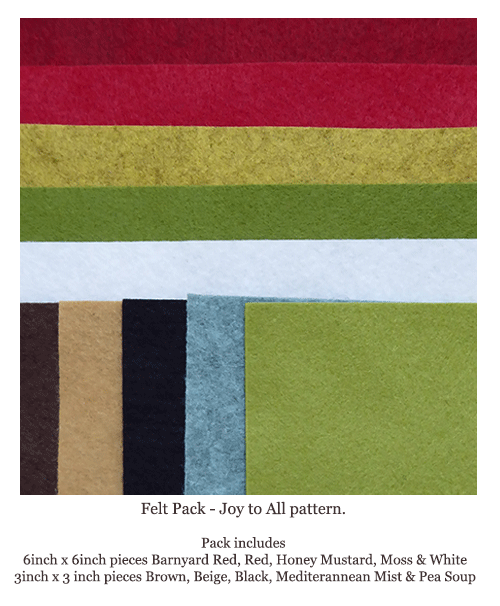 Pack includes Five felt pieces, approx. 15cm (6 inches) square Barnyard Red, Red, Honey Mustard, Moss & White. Five felt pieces approx. 7.5cm (3 inches) square Brown, Beige, Black, Mediterranean Mist & Pea Soup