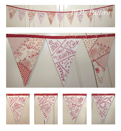 This project combines all the things I love, stitching and favourite fabrics. The flags are stitched with a Christmas alphabet with crazy patchwork flags in between.