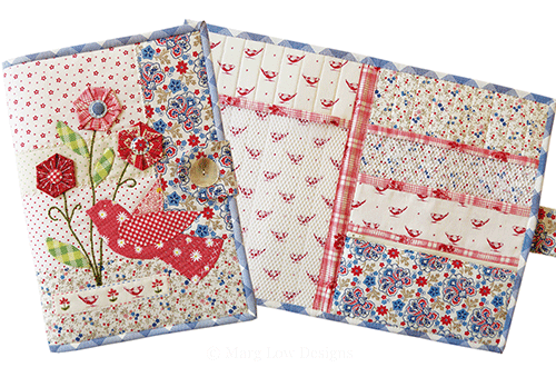 This is my getaway folder. It has a pocket for a favorite magazine, another for my sketch book and a zipper pocket for my pencils etc. Needle turn applique, folded hexagon flowers decorate the front. Perfect for your getaway items.