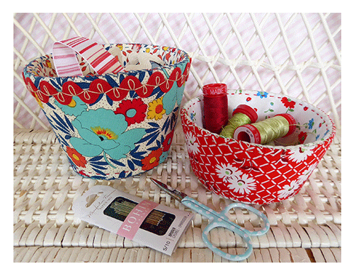 I love containers and these are one of my favorite projects to make. Entirely hand sewn. As you can see they're just the right size to pop your reels of thread or sewing scraps in.